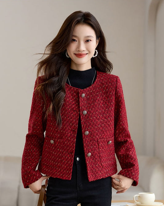 Red Plaid Tweed Short Women's Jacket