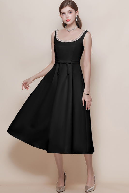Long Sleeve Black Midi Dress with Faux Pearl Embellishment