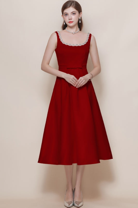 Women's Burgundy Cocktail Dress with Pearl Trim