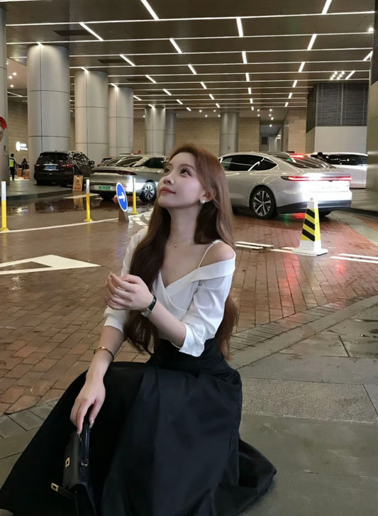 Korean Style White Off-Shoulder Blouse & Long Black Skirt Outfit