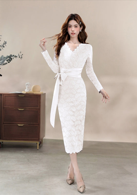 Elegant Cocktail Lace Sheath Dress with V-Neck and Sash Belt