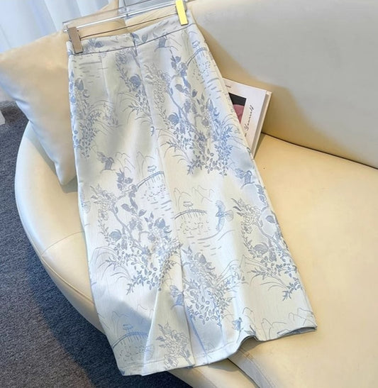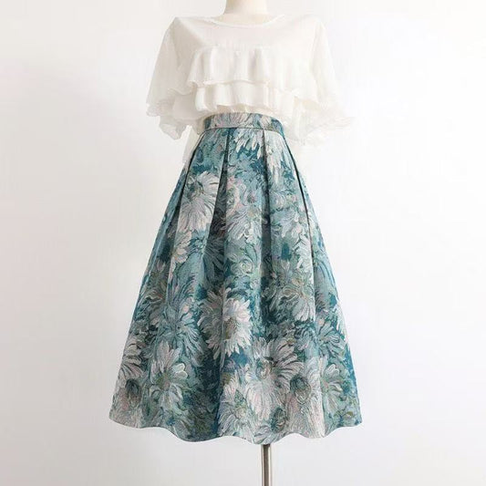 Textured Green and White Floral Jacquard Skirt