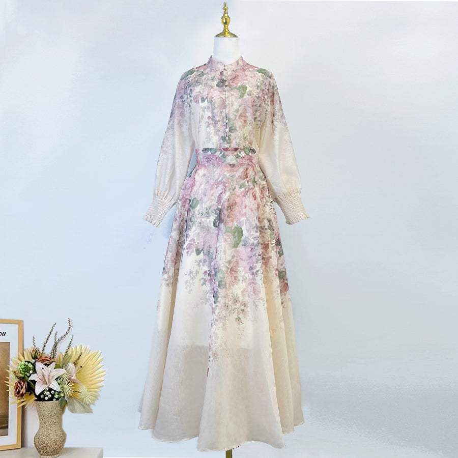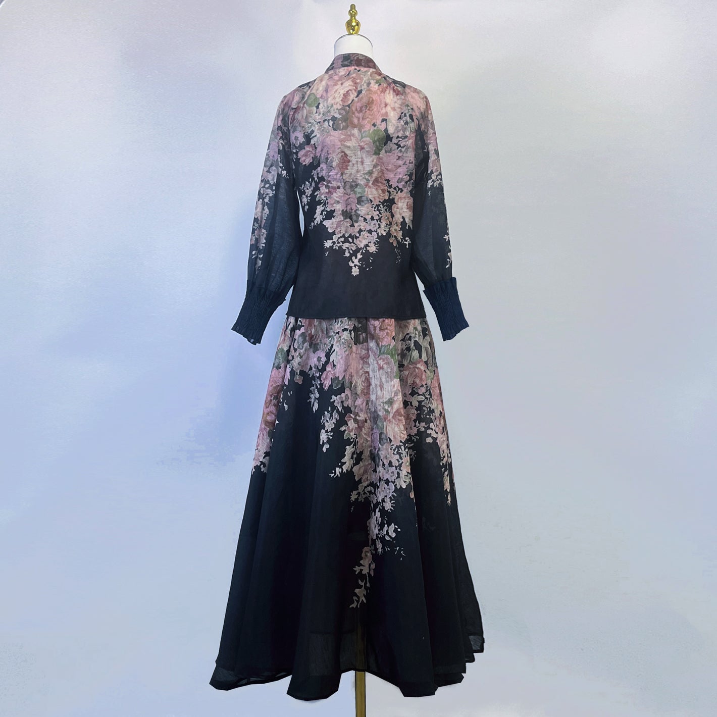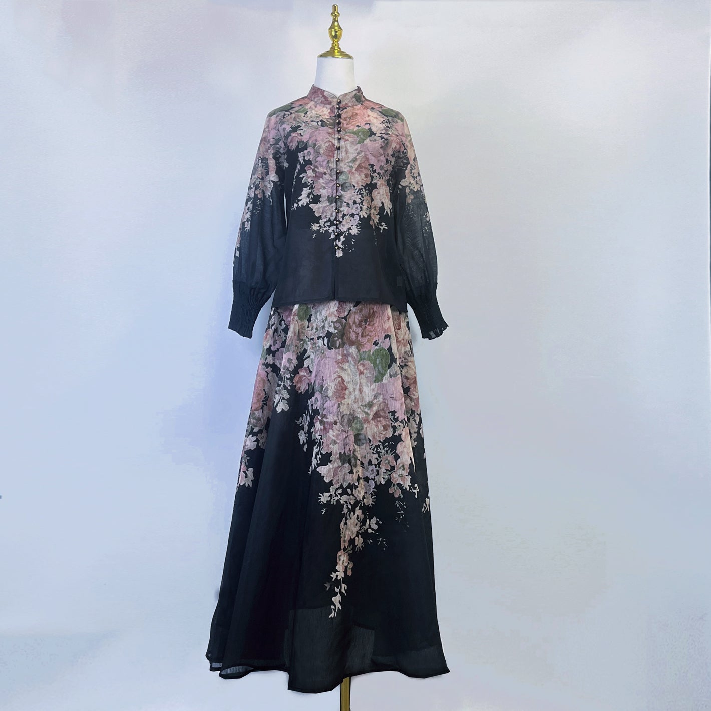 Coral Printed Shirt + High Waist Skirt Two-piece Set