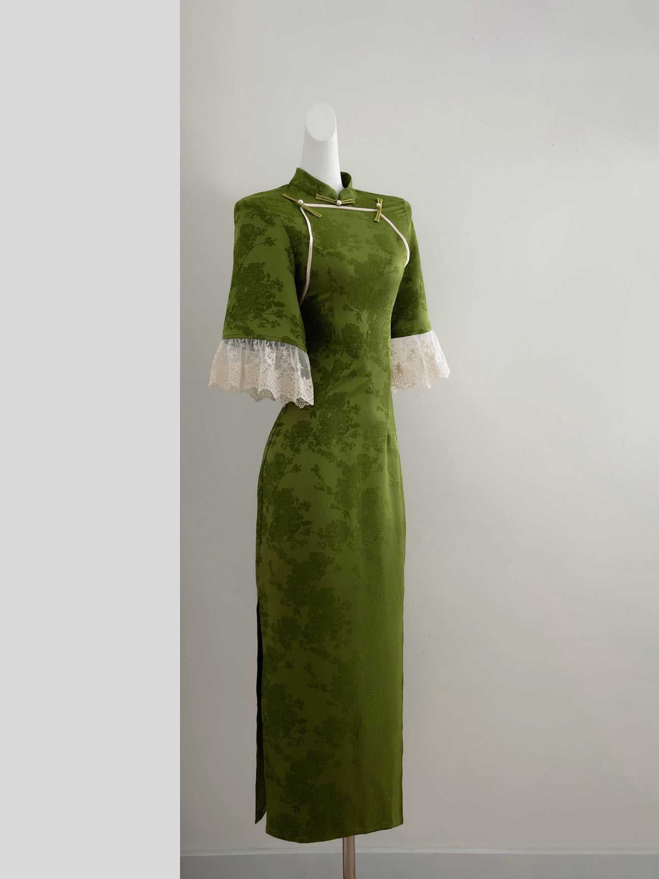 Green Brocade Cheongsam Dress with Lace Sleeves
