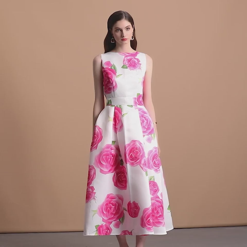 Pink Rose Floral Print Sleeveless A-Line Midi Dress