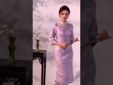Purple Jacquard Qipao Dress Half Sleeve Cheongsam with Lace Cuff